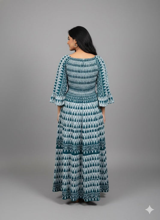 GREEN PRINTED SMOKE DRESS
