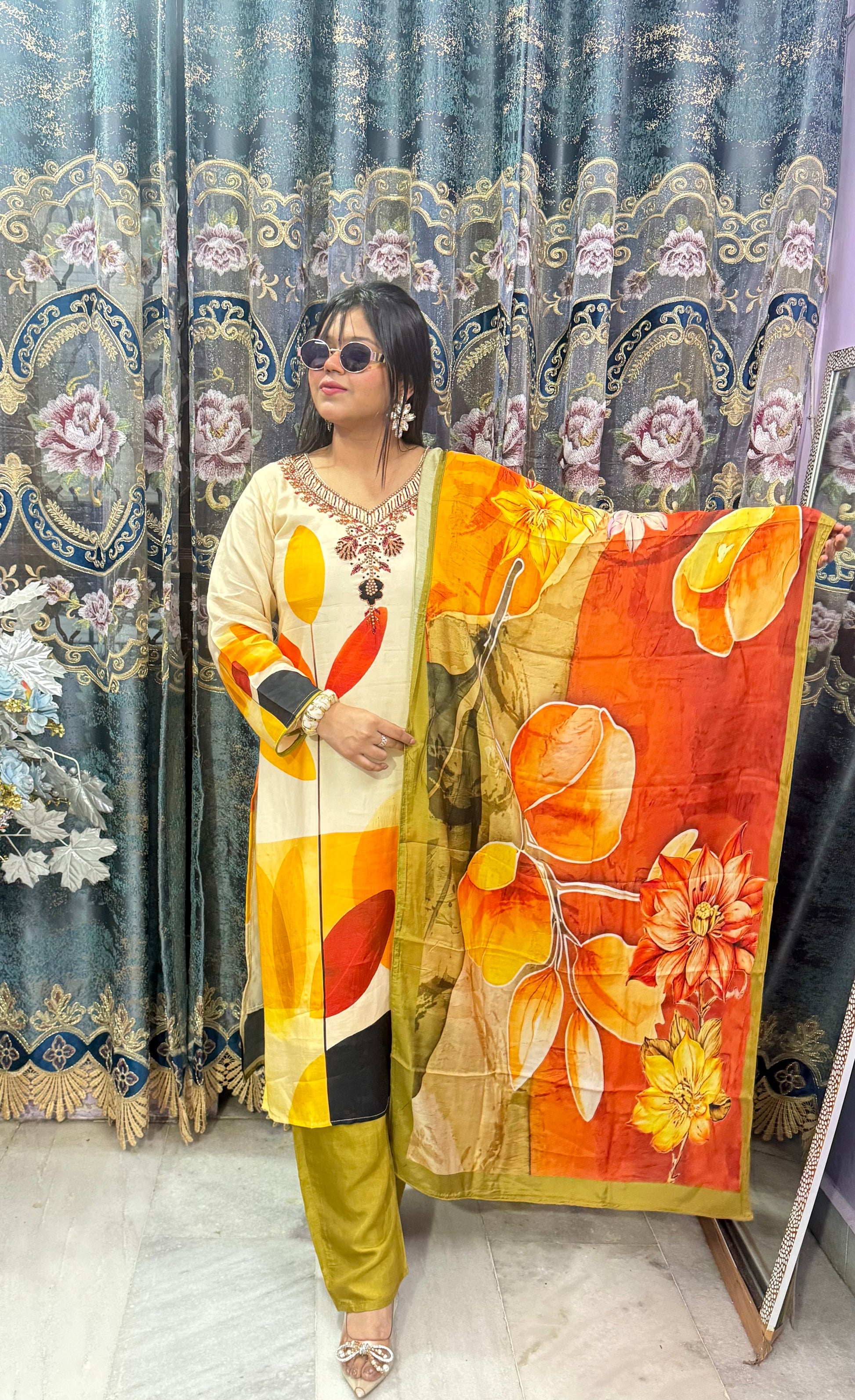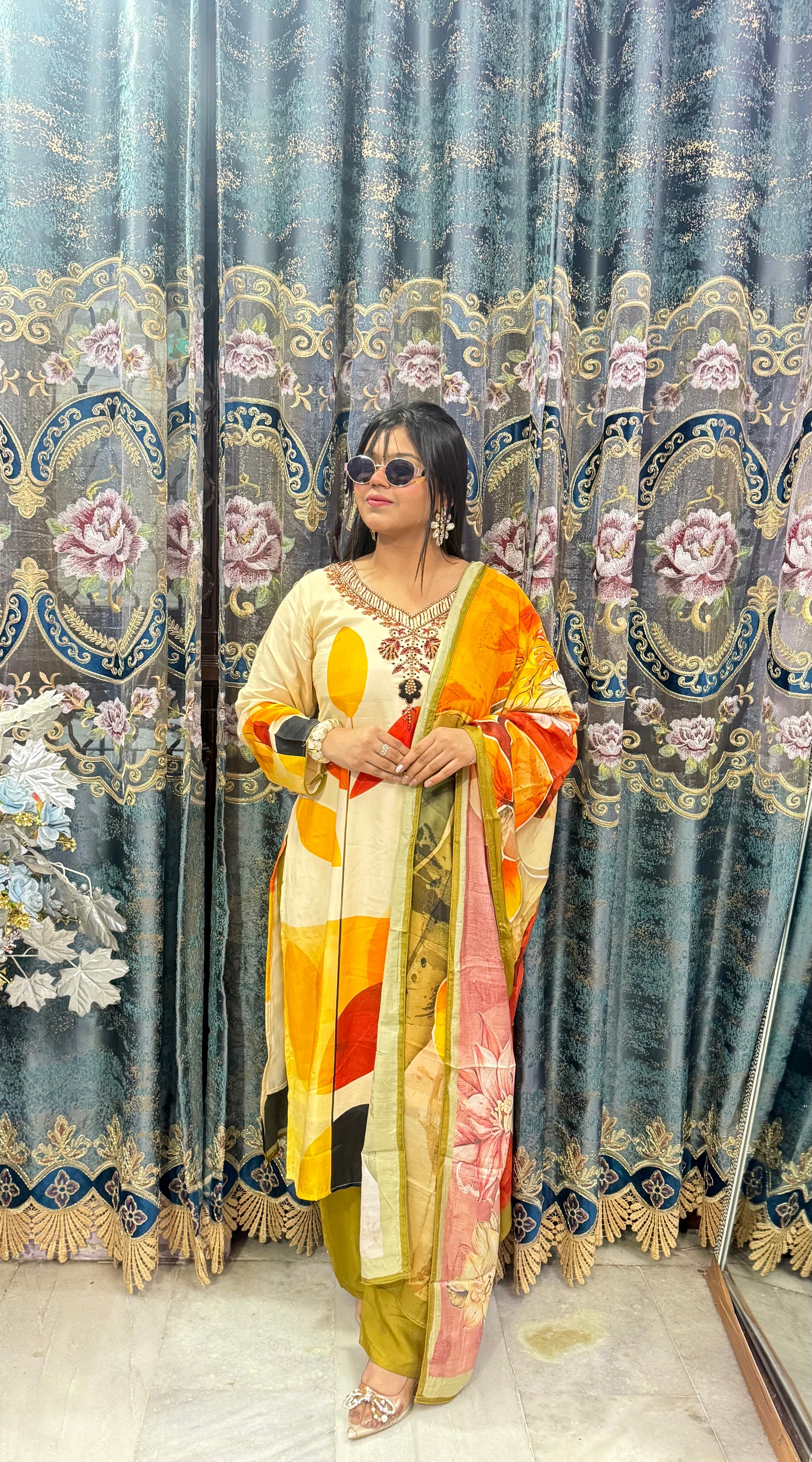 Experience elegance with this Designer Digital Print Suit, crafted for a perfect blend of style and comfort. The vibrant digital prints add a contemporary touch, making it ideal for festive occasions or casual gatherings. Its breathable fabric ensures all-day comfort while enhancing your graceful look. Elevate your wardrobe effortlessly with this versatile suit designed to make you feel confident and supported in every moment.