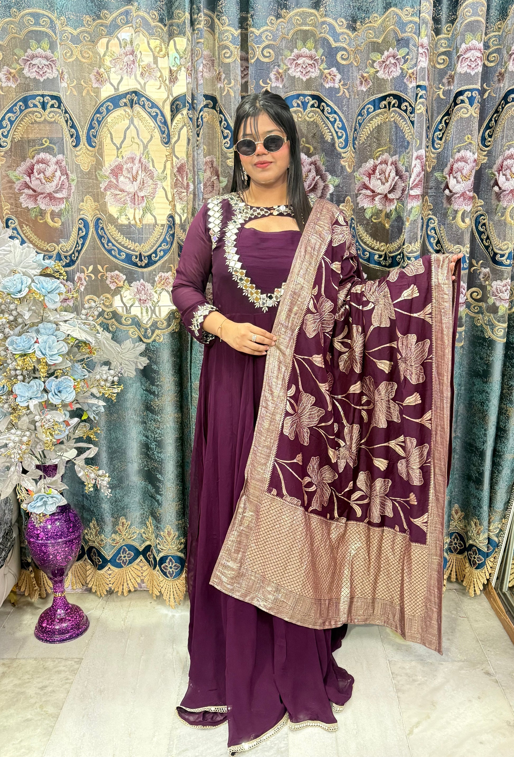 Designer Mirror Heart Anarkali With Banarshi Duppata