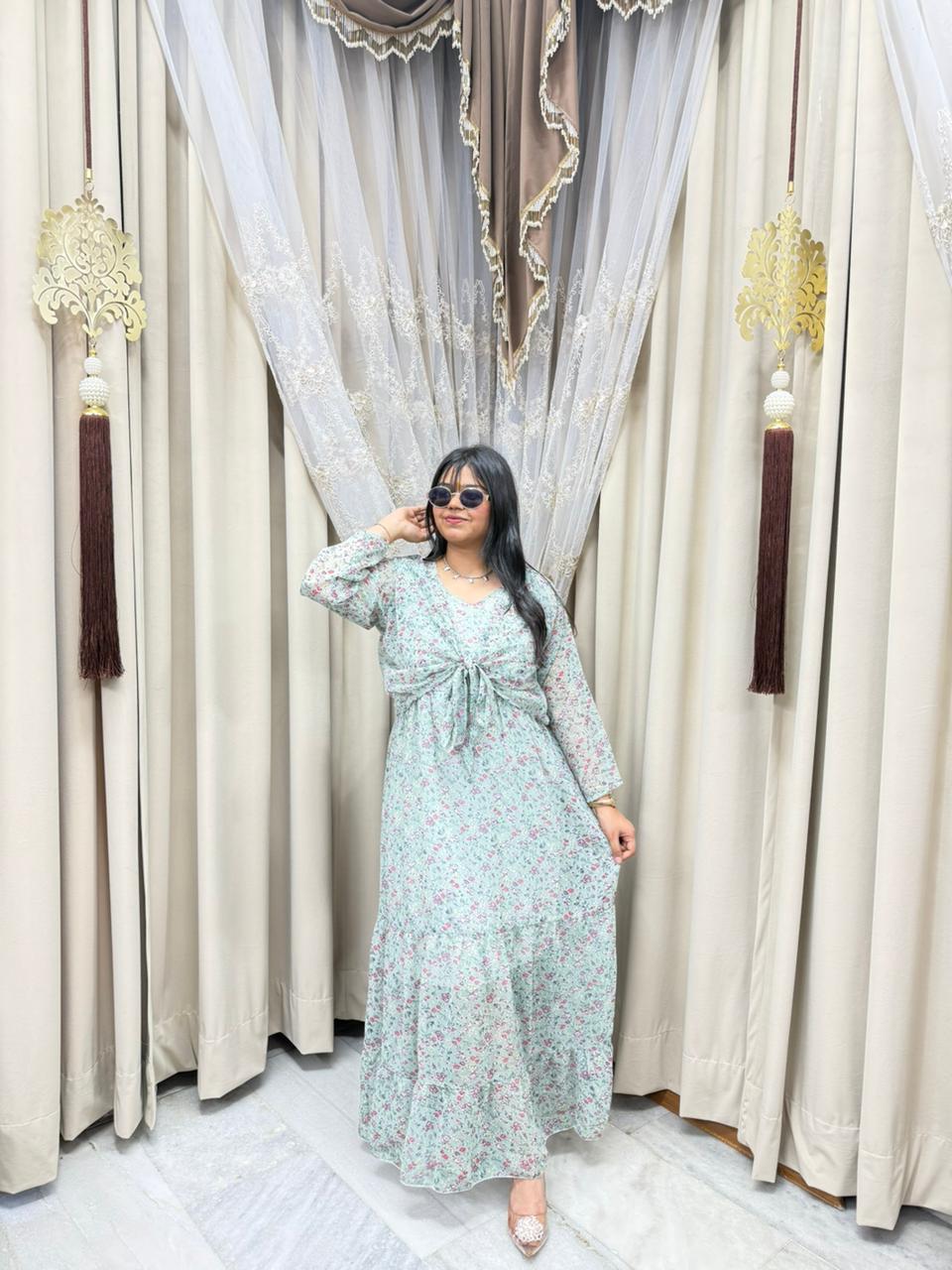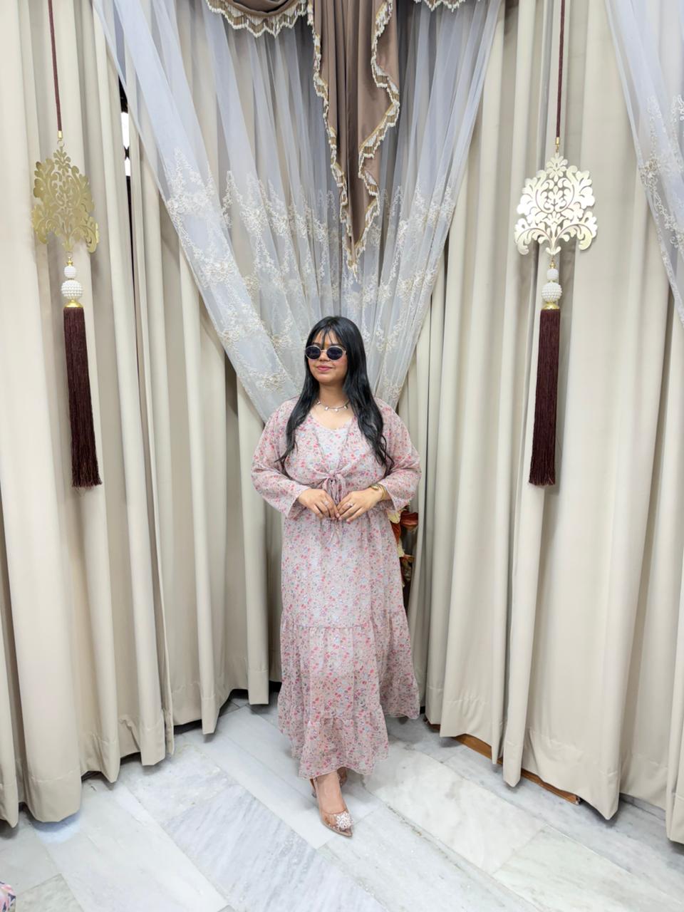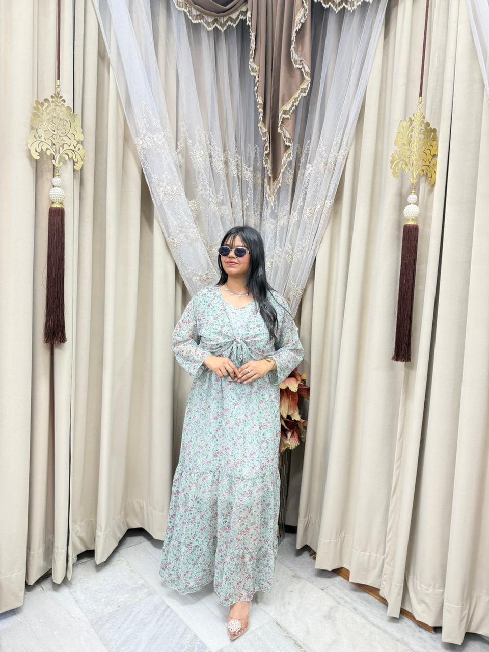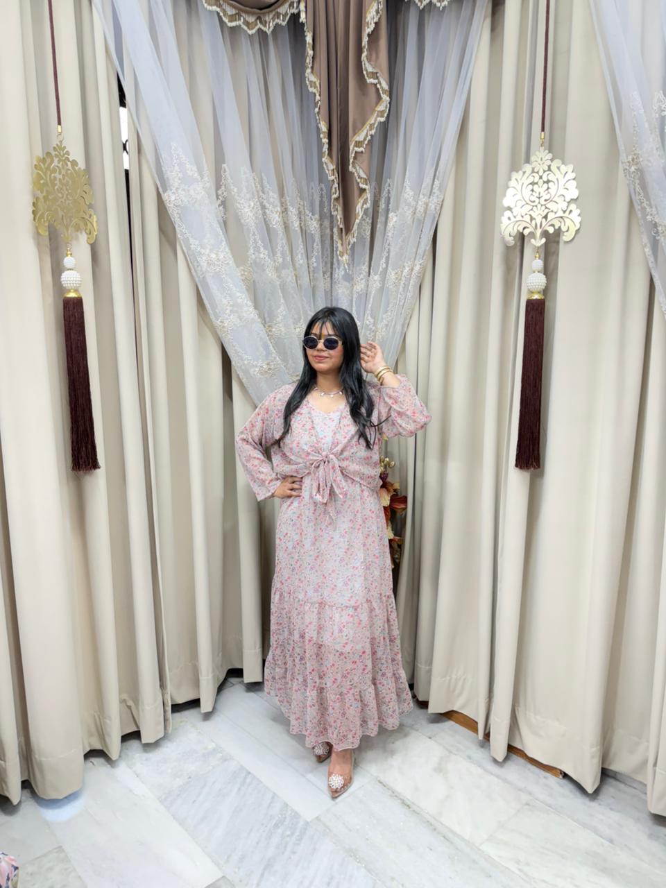 Stay trendy with this Pinterest inspired shrug dress, designed to give you a stylish and elegant look. Made from lightweight georgette fabric, this outfit is perfect for casual outings, parties, and daily wear. The stylish shrug design adds a modern touch, making it a must-have piece for your wardrobe.