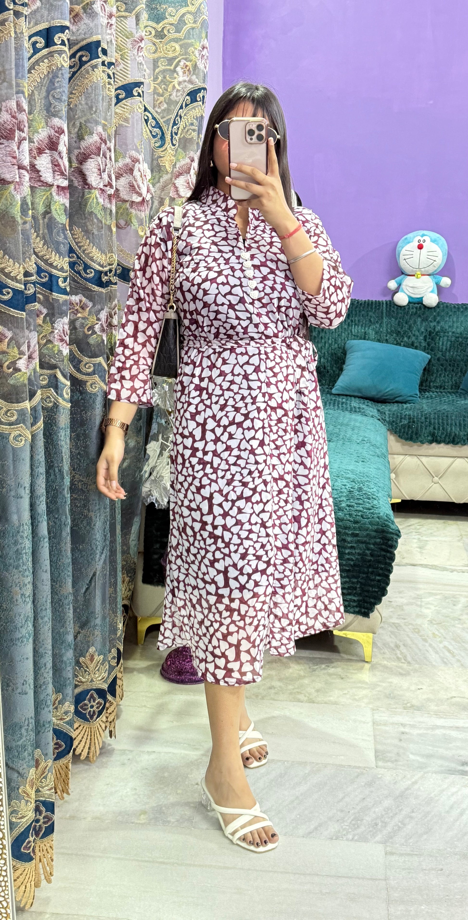 This adorable dress features a delicate heart print on lightweight georgette fabric. The perfect combination of pretty and playful, it's sure to become a wardrobe favorite. Stay effortlessly stylish with this charming and versatile dress.