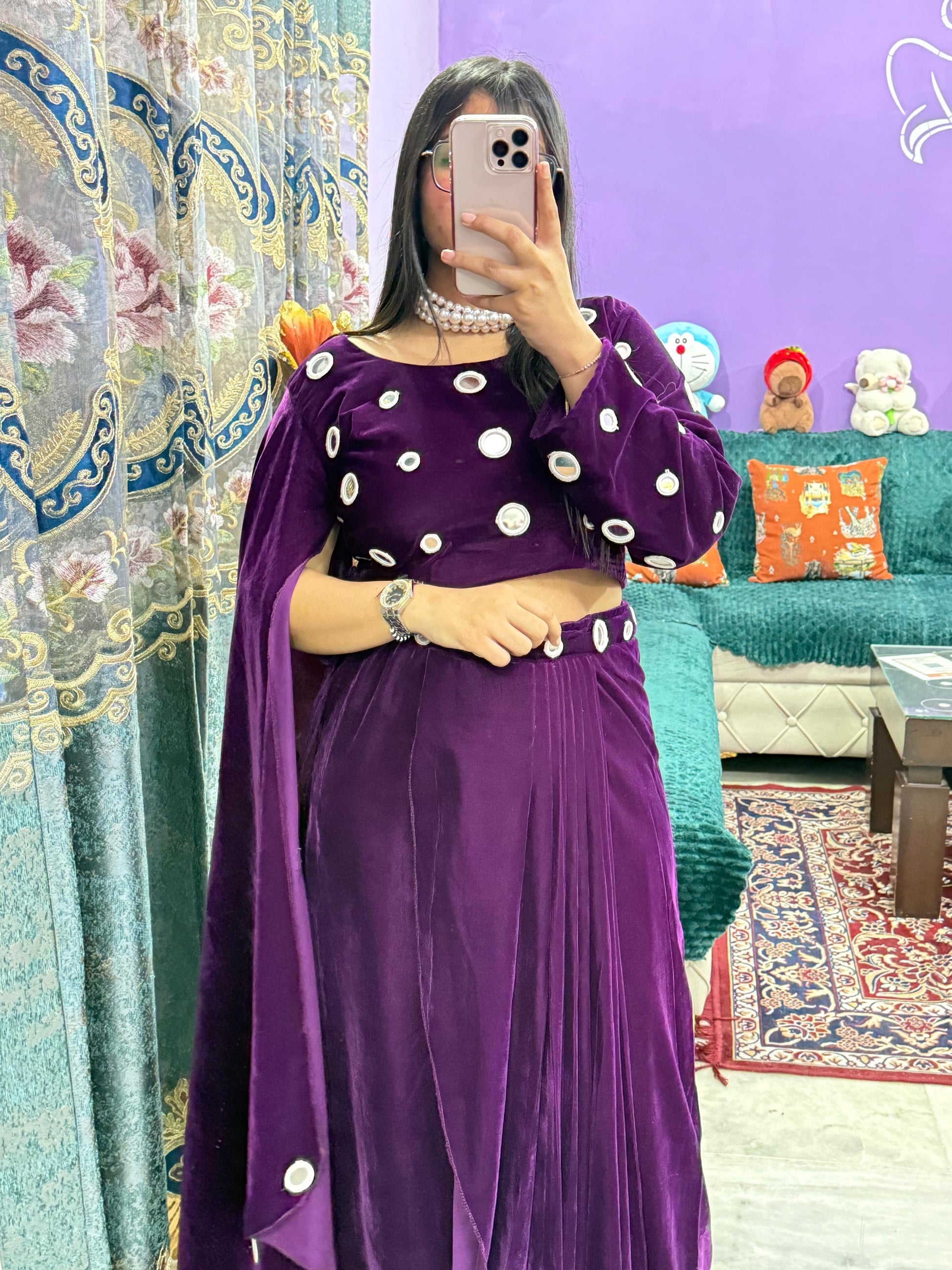 Embrace contemporary elegance with this stunning velvet Indo-Western saree, a perfect fusion of traditional draping and modern silhouettes. Crafted from luxuriously soft velvet fabric, this piece offers a rich, sophisticated look that transitions seamlessly from festive celebrations to upscale evening gatherings. The plush texture adds depth and dimension, while the Indo-Western styling allows for versatile draping options that suit your personal aesthetic. Whether you're attending a wedding, party, or special occasion, this saree celebrates your individuality while honoring timeless craftsmanship. Elevate your ethnic wardrobe with this statement piece that effortlessly blends tradition with contemporary flair.
